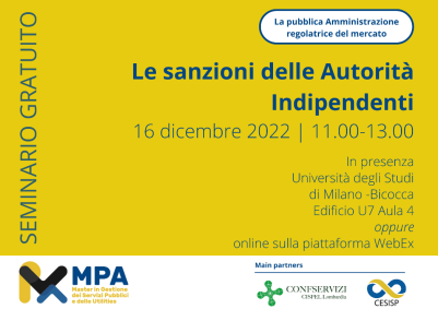 Il master MPA Gestione dei servizi Pubblici e delle Utilities, in collaborazione con Confservizi Lombardia e il CESISP, ha organizzato per venerdì 16 dicembre 2022 alle ore 11.00 il seminario dal titolo “La Pubblica Amministrazione regolatrice del mercato: le sanzioni delle Autorità indipendenti”.